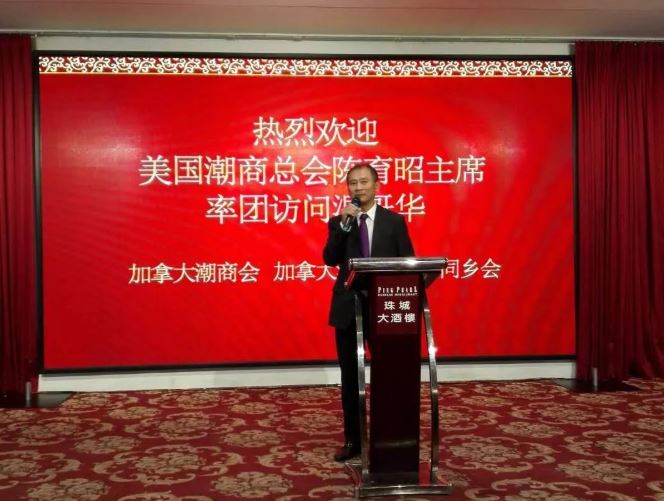 加拿大潮商会代会长郑焕明致欢迎辞。他说:“陈育昭主席是加拿大潮商会的名誉会长,虽然今天他是作为美国潮商总会的主席和代表团团长来这里,我仍觉得我们还是一家人。”