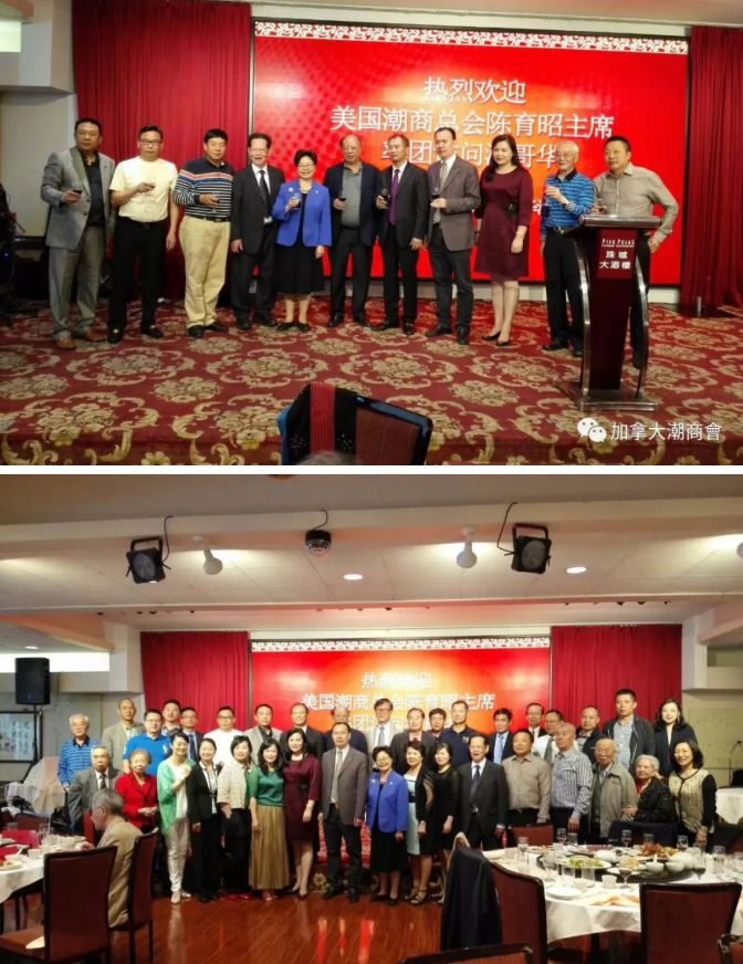 当晚,在珠城大酒楼,加拿大潮商会与温哥华潮州同乡会共同举行晚宴欢迎美国潮商总会陈育昭主席率团访问温哥华。加拿大长者事务部国防部长黄陈小萍出席晚宴并讲话。第九次世粤联会共同主席、加拿大潮商会创会会长林少毅,执行会长冯汝洁,副会长张林少莉,林维扬,理事朱春雄与下午参加座谈的加拿大潮商会领导出席了晚宴。副会长兼副秘书长陈少逢主持晚宴欢迎仪式。